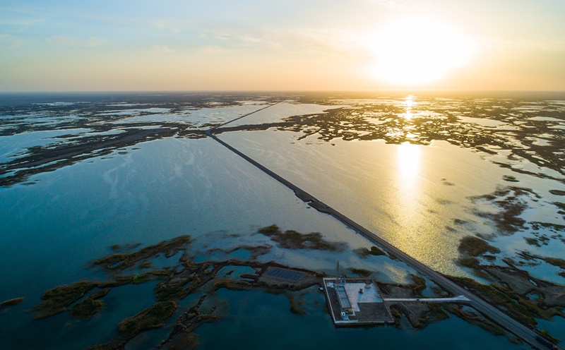 从新疆若羌县城沿218国道一路向北行驶约55公里,便会看到一处沙漠中难得见到的景象——道路两旁水波荡漾,绿意丛生。